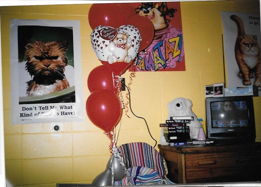 Even though we didn’t start dating until after I graduated, our friendship was gradually changing while I was still in school. During my senior year of college, he was very thoughtful. For example, on Valentine’s Day, he stopped by my dorm room. Of course, I had been on my stair stepper for hours and wouldn’t come to the door. I kept yelling over the music, “I’m not done yet!” He waited as long as he could, but eventually he had to leave for work. When I finally finished my routine, I got my stuff together and headed for the dorm showers. When I opened my door, there was an overwhelmingly huge bouquet of balloons and a card.