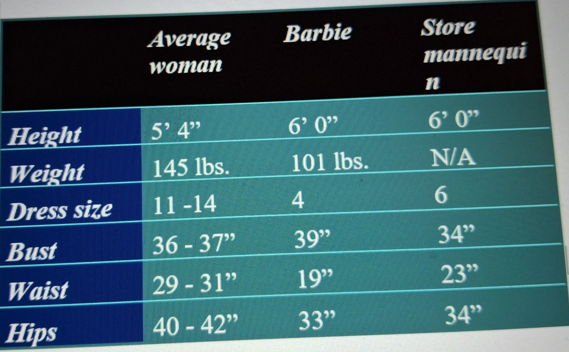 Most females grew up, playing with Barbie dolls. We were heavily influenced by her image. And it was a rigid, unrealistic, and unhealthy image. Check out how the Barbie doll's dimensions contrast to those of a "real woman."